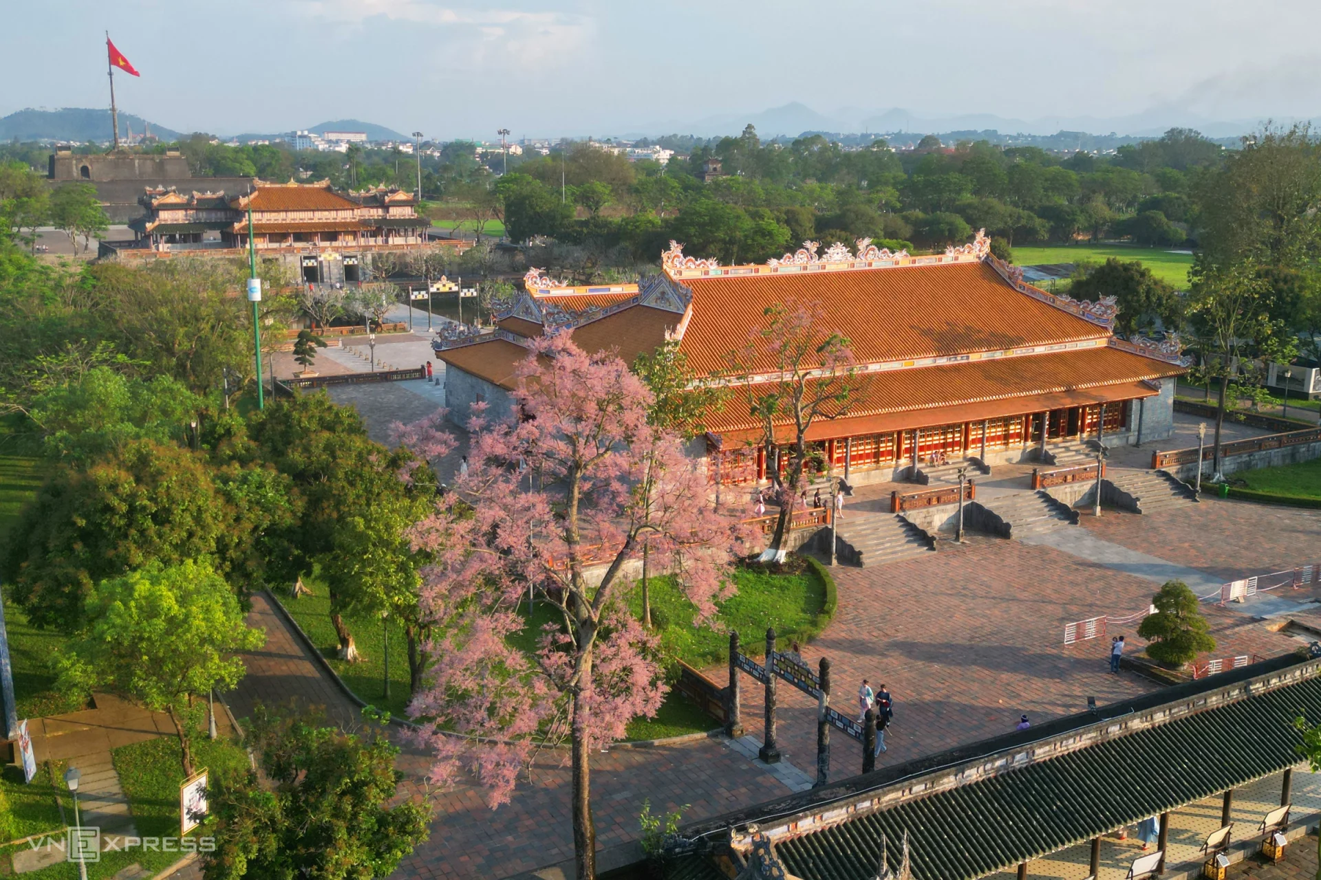Hoa ngô đồng nở rộ trong hoàng cung Huế và các tuyến đường ở quận Thuận Hóa, Phú Xuân, tô điểm cho các công trình cổ kính.