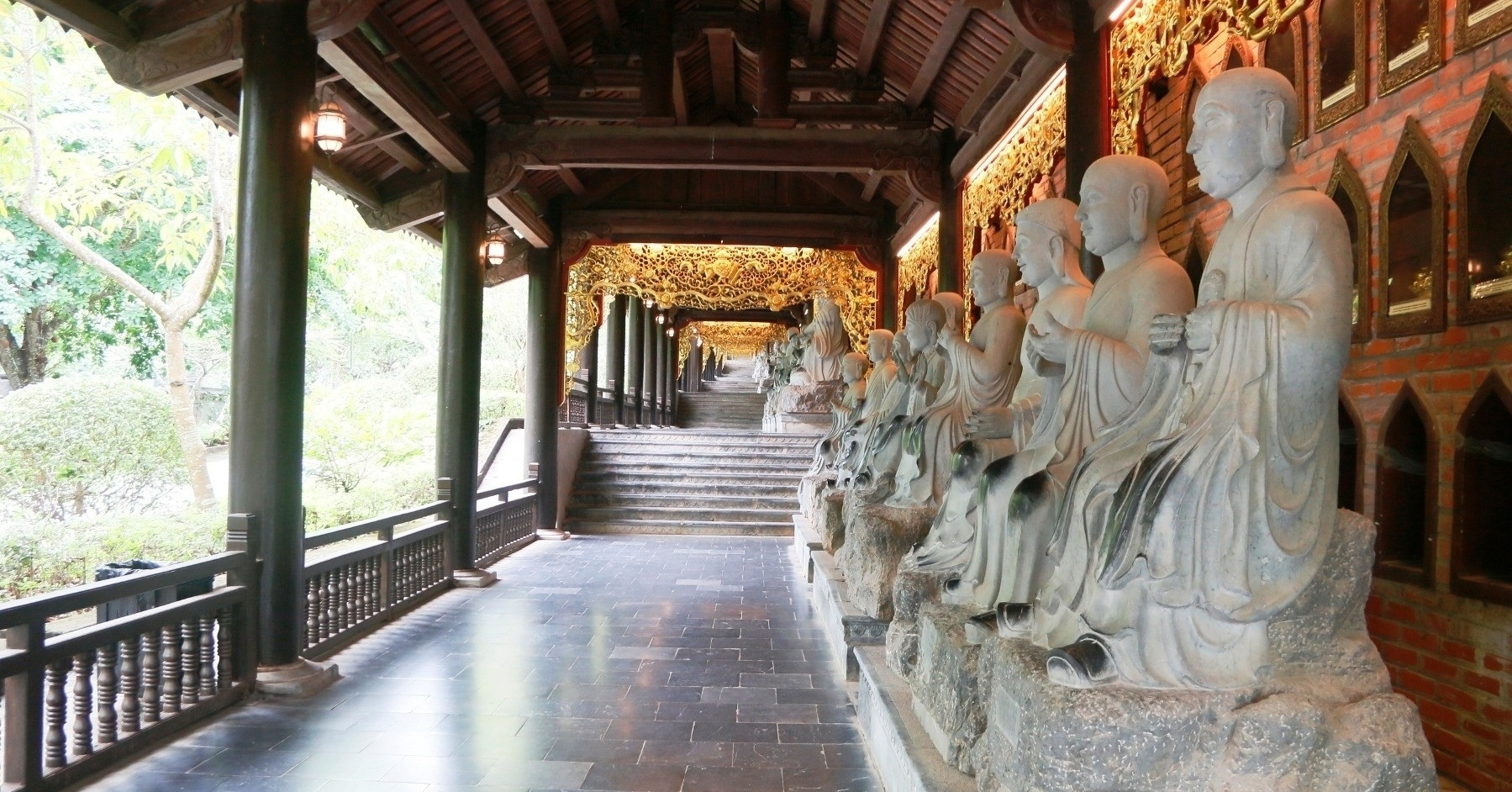 🙏 500 pho tượng La Hán bằng đá xanh – trải dài hai bên hành lang, mỗi pho mang một thần thái riêng biệt.
